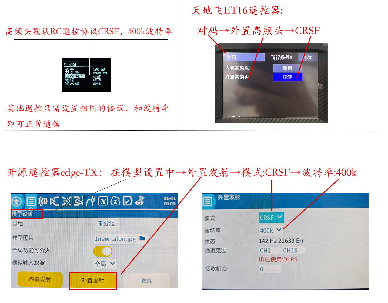 - 发射机和接收机到手无需额外设置,默认内置相同出厂配对码和频率,通电即可自动连接通信只需要简单安装和设置遥控器对应参数即可‘’